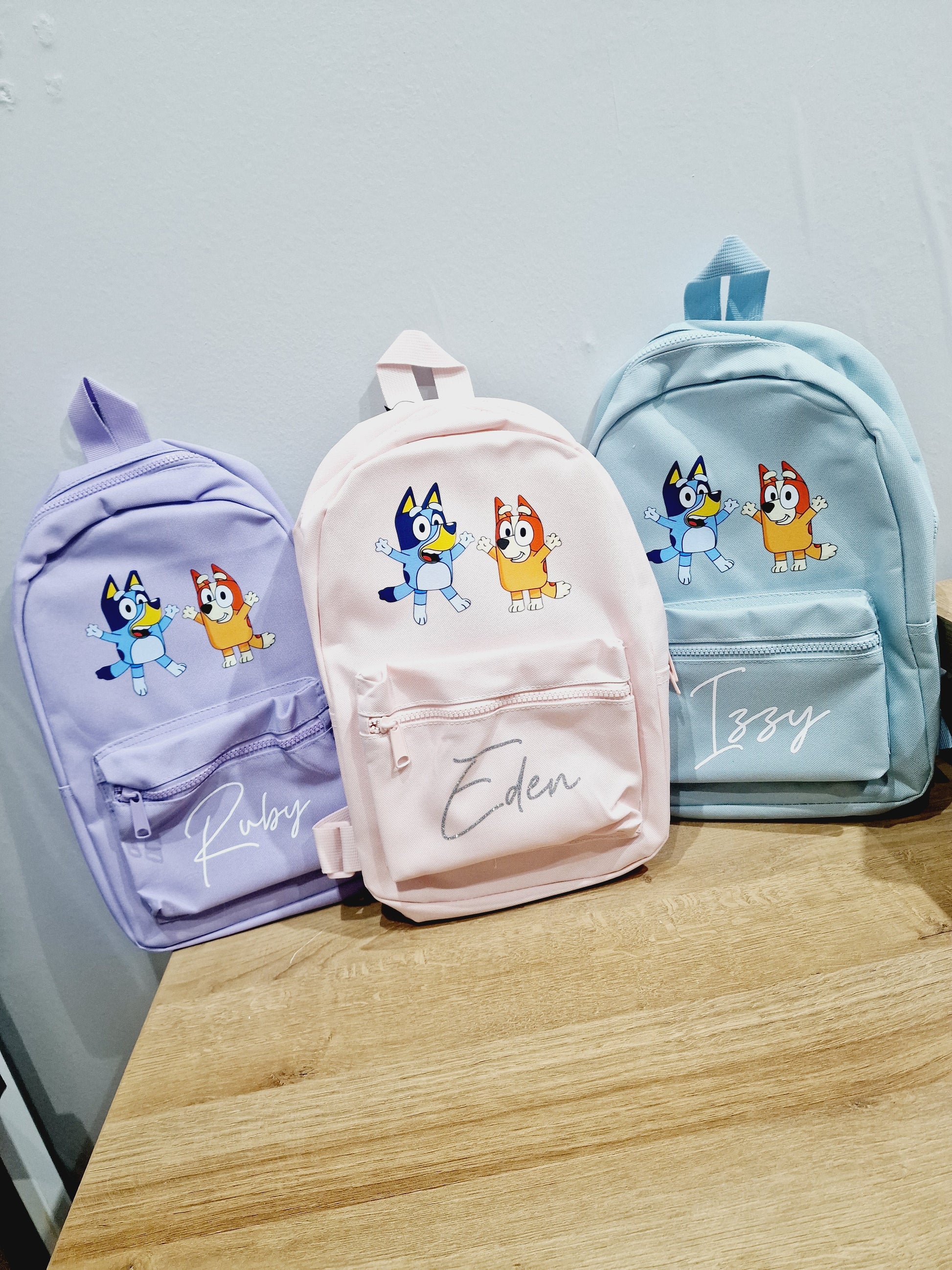 Personalised childrens ( or pets) backpack they come in a range of colours and I can personalise with an initial or image with the name going across in a contrasting colour.